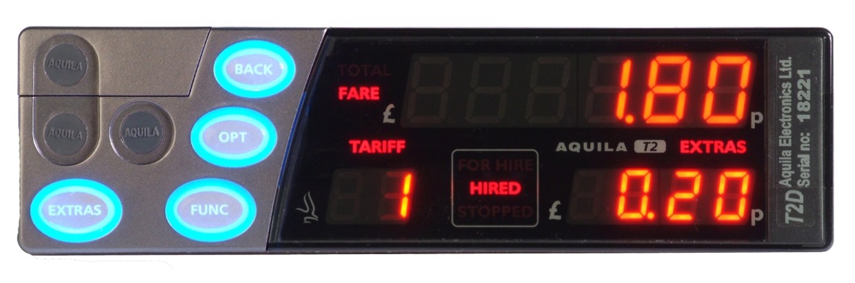 The T2 has extensive tariff capabilities and may be programmed by your dealer to handle any combination of time, distance and fares. It can hold a large number of "special day" information in order for it to automatically select the correct rate to charge, or it can be completely manual, so that you choose the tariff you want to charge.